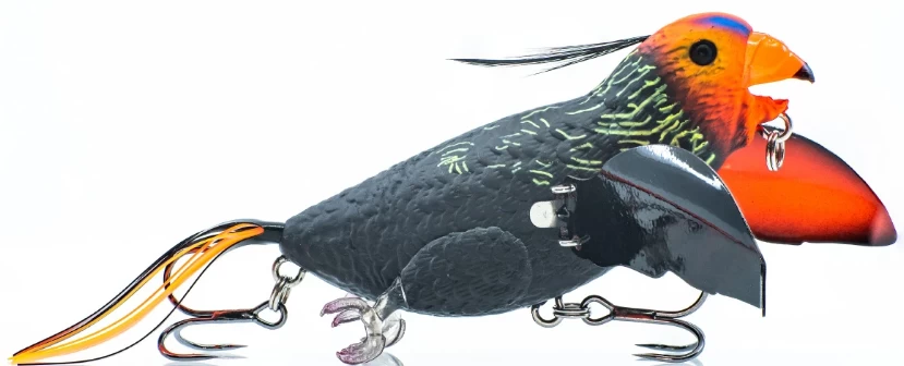 Chastbaits’ The Smuggler is a water blooping, rattling, topwater crawler with an incredible life-like swimming bird action. Fitted with a long trailing tail to simulate tail feathers, a matching head feather and colorways to imitate the most common birds that big predators like bass, pike, muskie, and snakehead feed on.